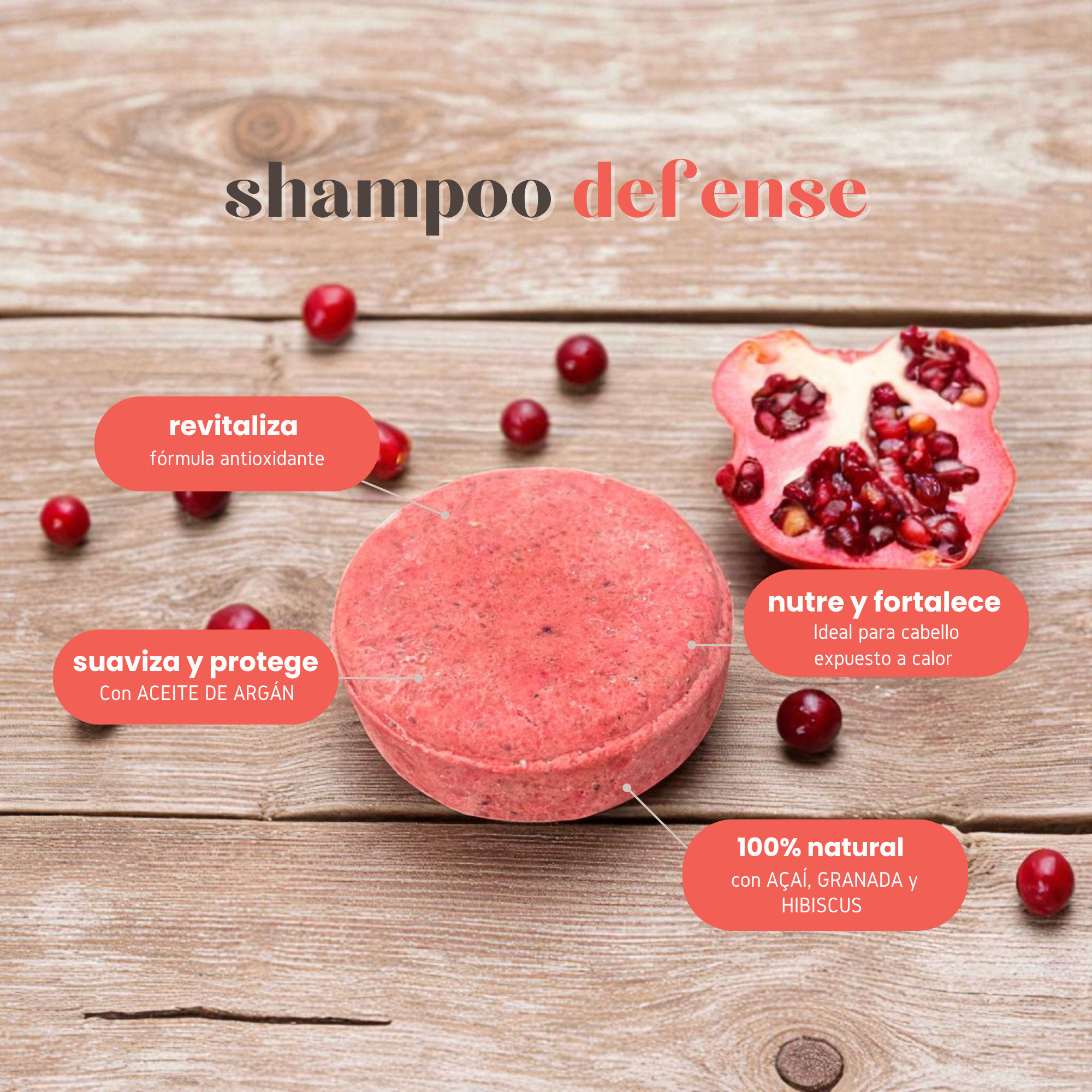 Shampoo sólido con AÇAÍ, GRANADA y HIBISCUS que ayuda a proteger el cabello del daño ambiental.