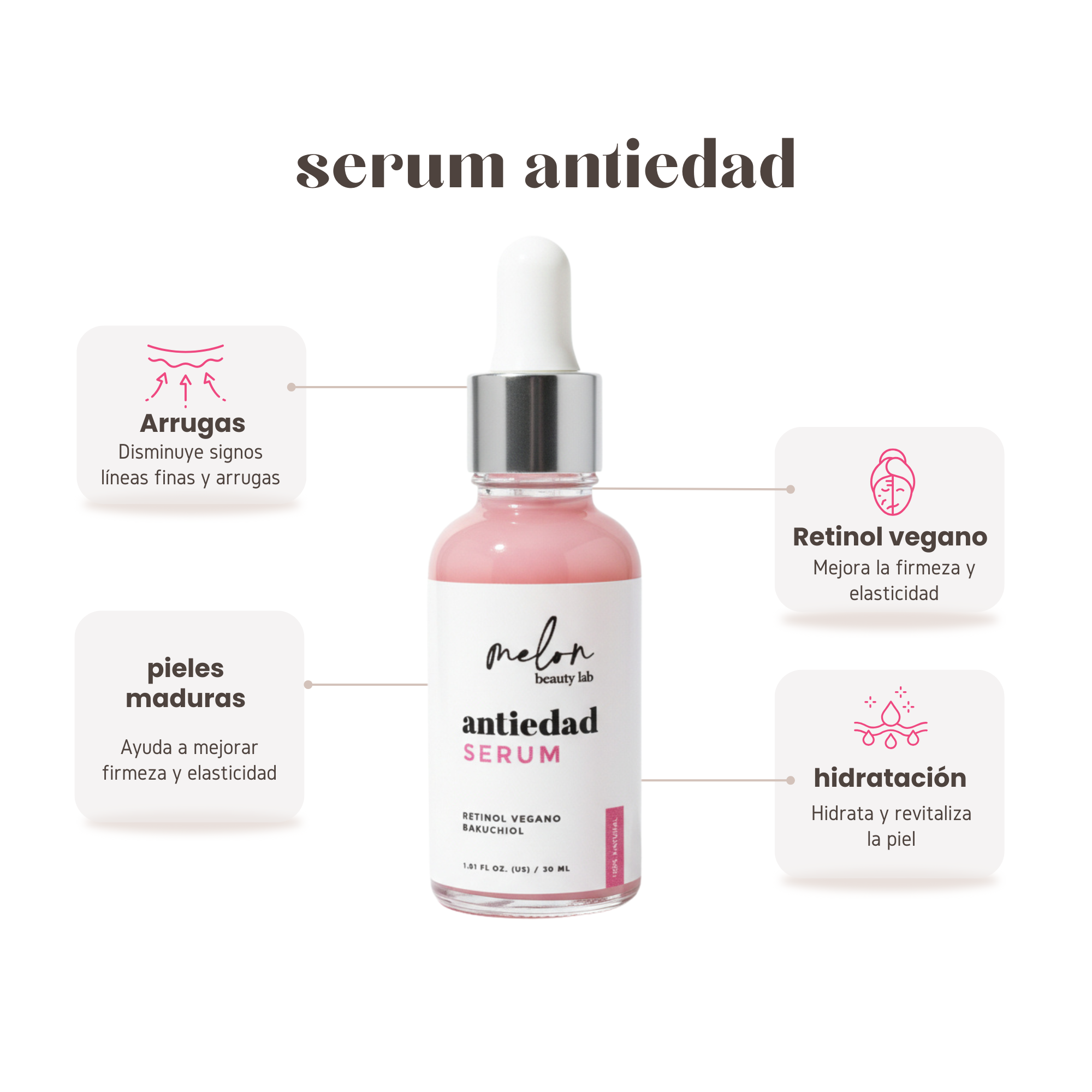Suero con BAKUCHIOL, HIBISCUS y GOJI que ayuda a disminuir arrugas y mejorar la hidratación.