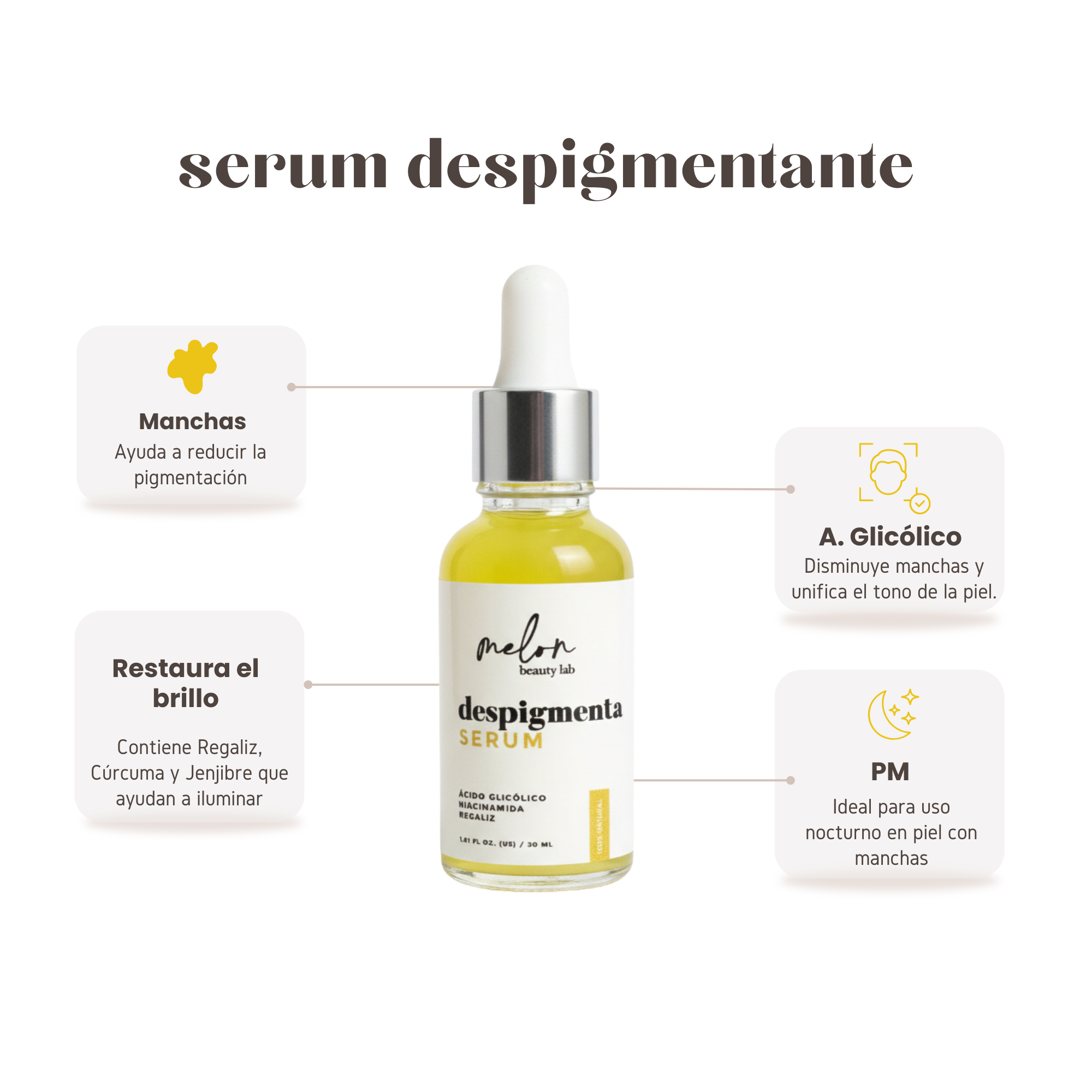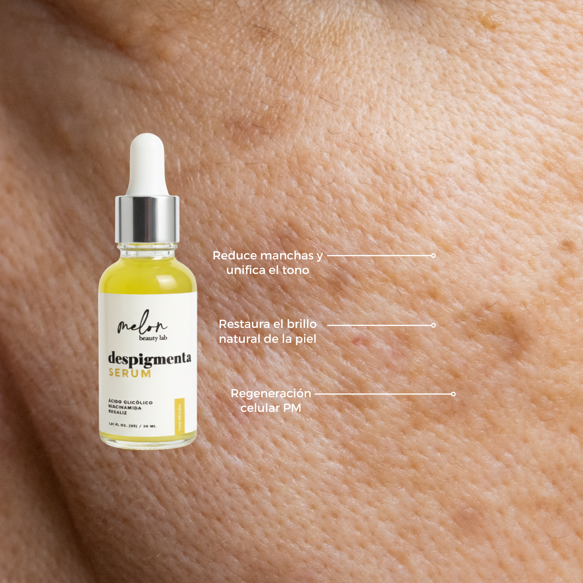 Suero con ÁCIDO GLICÓLICO y NIACINAMIDA que ayuda a disminuir manchas y unificar el tono de la piel.