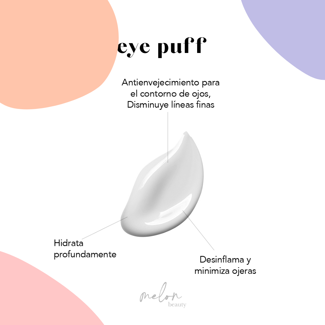 Eye Puff: Crema Contorno de Ojos para prevenir signos de la edad y cansancio. Disminuye signos de cansancio en el contorno de ojos, desinflama bolsas, ojera, disminuye líneas finas y arrugas al mismo tiempo que hidrata a profundidad.